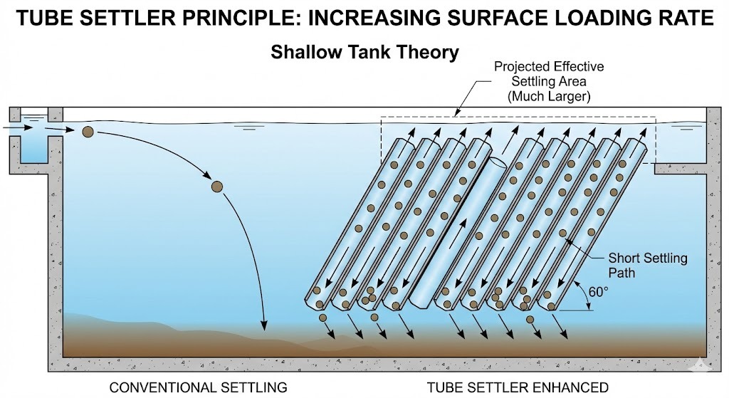 กระบวนการนี้ช่วยลดพื้นที่ที่ต้องใช้สำหรับบ่อตกตะกอนรองลงอย่างมาก แทนที่จะเป็นถังขนาดใหญ่และลึก คุณสามารถได้รับผลลัพธ์เดียวกันโดยใช้พื้นที่ที่เล็กกว่ามากโดยการติดตั้ง โมดูล PVC หรือ PP Tube Settler ที่ทนต่อรังสียูวี ที่มุม 60 องศา