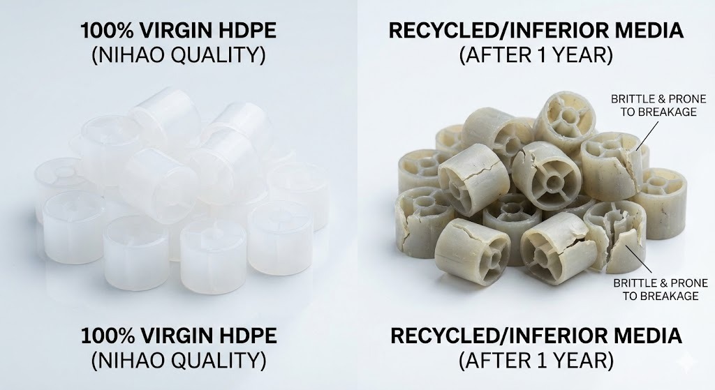 100% Virgin HDPE (โพลีเอทิลีนความหนาแน่นสูง) เป็นที่ต้องการเนื่องจากมีความแข็งแรงเชิงกลที่เหนือกว่า ทนต่อสารเคมี และความหนาแน่นที่ถูกต้อง (0.95-0.97 g/cm3) สำหรับฟลูอิไดเซชัน วัสดุรีไซเคิลมักมีสิ่งเจือปนที่ทำให้สื่อเปราะหรือจม ส่งผลให้ระบบล้มเหลวภายใน 2-3 ปี