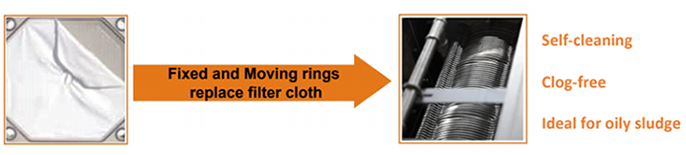 การหมุนของเพลาสกรูจะดันให้แหวนเคลื่อนที่หลุดออกจากวงแหวนยึด ซึ่งจะทำให้กระบวนการทำความสะอาดตัวเองเป็นไปอย่างต่อเนื่องและอัตโนมัติ ทำให้สามารถแยกน้ำออกได้อย่างเสถียรและคงที่โดยไม่ต้องพึ่งน้ำฉีดล้างแรงดันสูงเพื่อป้องกันการอุดตัน นอกจากนี้ยังช่วยให้เหมาะสำหรับกากตะกอนน้ำมัน ซึ่งทำให้เกิดการอุดตันได้ง่ายและยากต่อการบำบัดด้วยอุปกรณ์แยกน้ำประเภทอื่นๆ