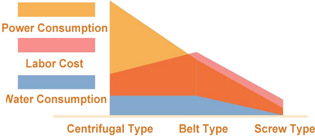 ในฐานะที่เป็นส่วนประกอบหลัก สกรูจะหมุนช้ามากที่อัตรา 2-4 รอบต่อนาที ไม่จำเป็นต้องมีการรวมขนาดใหญ่เช่นลูกกลิ้ง ดังนั้นจึงใช้พลังงานต่ำมากและเป็นมิตรต่อสิ่งแวดล้อม การใช้พลังงานของสกรูเพรสคือ 1/20 ของเครื่องหมุนเหวี่ยงซึ่งต้องการการหมุนด้วยความเร็วสูง 1/8 ของการกดสายพาน ซึ่งเพียง 0.01-0.1 Kwh/กิโลกรัม-DS กลไกการทำความสะอาดตัวเองที่เป็นเอกลักษณ์ช่วยป้องกันไม่ให้ตาข่ายกรองอุดตัน จึงไม่จำเป็นต้องใช้น้ำปริมาณมากในการป้องกันการอุดตัน ปริมาณน้ำทำความสะอาดที่ต้องการคือประมาณ 1/115 ของการกดสายพานและ 1/62 ของเครื่องหมุนเหวี่ยง